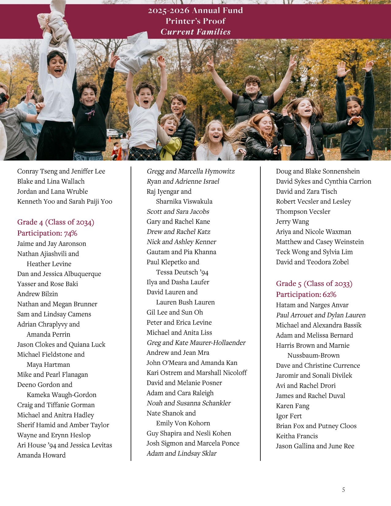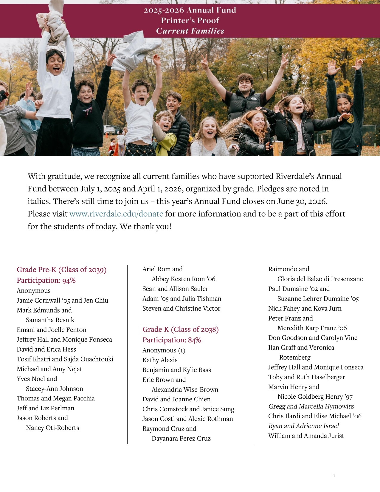 Please review your listing carefully. If you find any errors or have questions, we ask that you contact Soo Mi Thompson, Annual Fund Director, at sthompson@riverdale.edu or 718-519-2741. We are grateful for your partnership and proud to recognize your commitment to Riverdale.